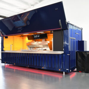 We built this Container Restaurant out of a 20ft shipping container. The client requested this size as space was limited at the site it was being delivered to. Shipping containers are becoming more and more popular being used in this application due to their portability and secure properties.