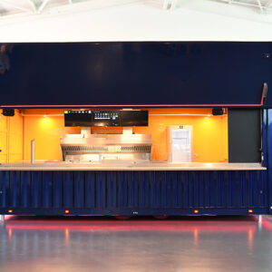 This 20ft Container Restaurant was fully insulated with air conditioning inside and featured a 2.4 metre awning and servery window, personnel door with viewing window, stainless steel counter, stainless steel tub with mixer tap, fridges and stainless steel cookers. We also installed commercial grade coved vinyl flooring so the container can be easily washed out at the end of the days trade.